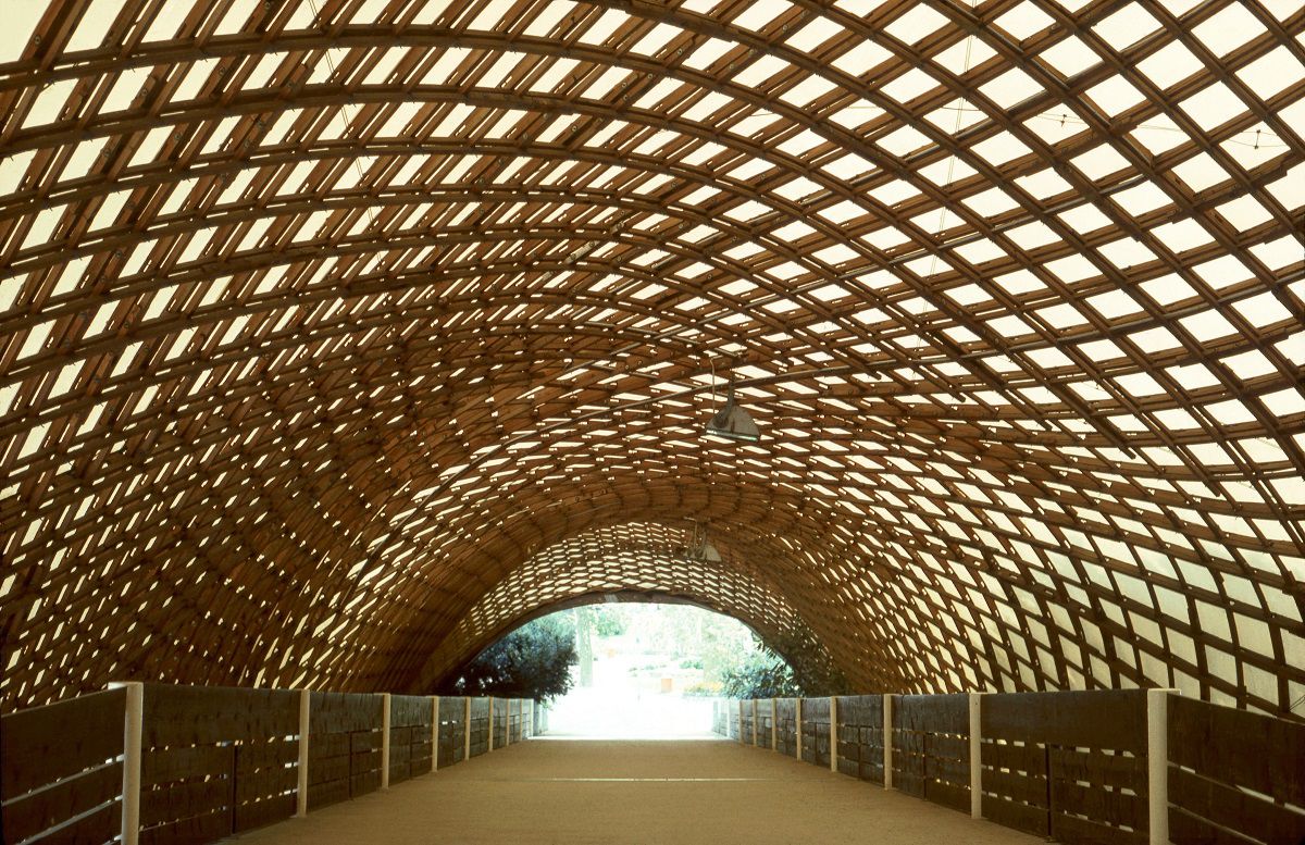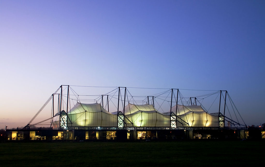 Преимущества тентовых покрытий успели оценить многие руководители зданий производственного типа. Конструкции позволяют непрерывно и оперативно обновлять существующие технологические процессы, внедрять инновации в рабочий процесс, заниматься модернизацией. Эти аспекты практически невозможно реализовать при наличии жесткой сетки колонн. К примеру, чего только стоит величественный научный Шлумбергер-центр в Кембриджер. Проект был создан и успешно реализован архитектором М.Хопкинсом еще в 1986 году. Важно отметить наличие у тентового покрытие трехчастотной структуры, что способствует организации технологически необходимого единого пространства, без каких-либо дефектов, диссонанса с окружающей средой. Подобного рода сооружение содержит каркас и систему стабилизации, вынесенных снаружу. Это позволяет говорить о примере образного, символического представления конструкции пространственной.