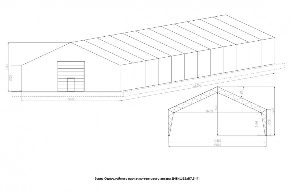 Однослойный каркасно-тентовый ангар (для хранения МТР), по внешним размерам Д48хШ15хВ7,5м, высота боковой прямой стены 4 м.